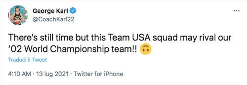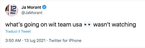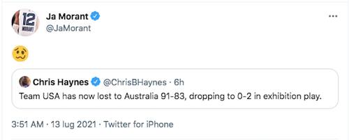 Il doppio passo falso da parte della squadra allenata da coach Popovich che si sta preparando per le Olimpiadi di Tokyo - due sconfitte in fila della nazionale americana non si vedevano da oltre 30 anni in amichevole - ha lasciato perplessi diversi commentatori e anche tanti giocatori, alcuni dei quali avrebbero forse meritato un’opportunità in squadra. Da Trae Young a Ja Morant: le loro reazioni via Twitter affidate a qualche emoticon, raccontano molto bene lo stato d’animo di tifosi e appassionati negli USA
