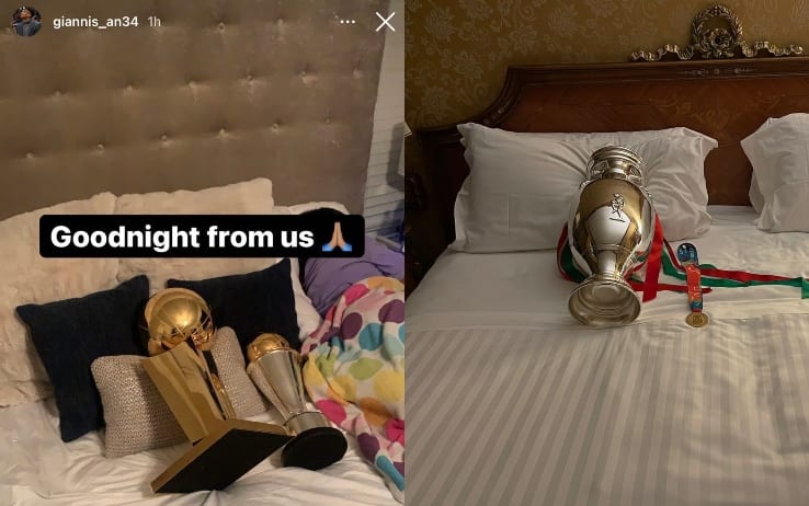 socialIl n°34 greco, reduce da una prestazione leggendaria da 50 punti contro i Phoenix Suns, ha postato su Instagram una foto: “Buonanotte da parte nostra”, a letto insieme al Larry O’Brien Trophy e al premio di MVP delle Finals. Una foto che ha riportato alla mente quanto fatto meno di due settimane fa dal capitano dell’Italia che, come fatto anche da Fabio Cannavaro nel 2006, ha deciso di portarsi in stanza la coppa