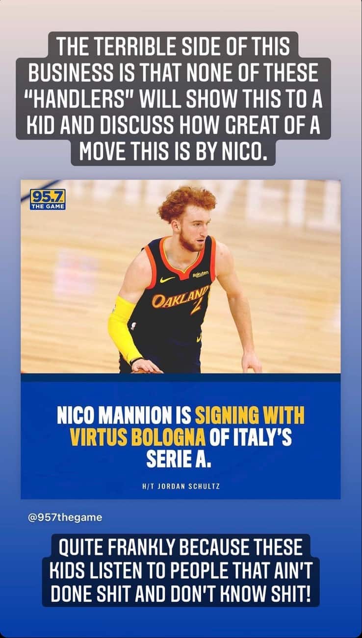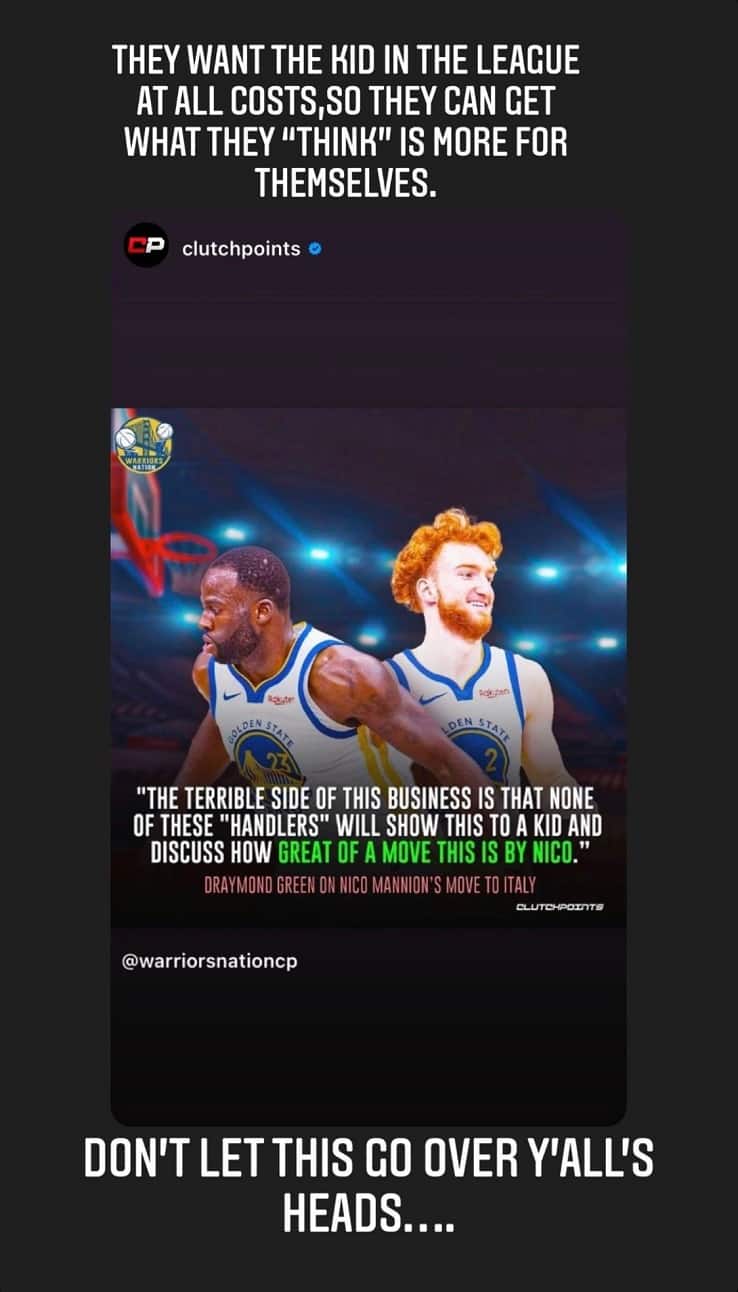 In campo assieme, in tutta la stagione, Nico Mannion e Draymond Green hanno condiviso soltanto 34 minuti, nell'arco di 9 gare, ma si sa che il grande veterano degli Warriors è uno dei giocatori che più ha a cuore le sorti dei suoi compagni, spesso scontrandosi magari con le superstar ma mettendo il suo bagaglio di esperienza al servizio di tutti. Così, quando l'annuncio della firma di Nico Mannion per la squadra campione d'Italia, la Virtus Bologna, ha fatto il giro del mondo, arrivando ovviamente anche sulla Baia, Green ha voluto dire la sua sulla mossa del suo (ormai ex) compagno, che sui social d'oltreoceano veniva evidentemente criticata come una rinuncia affrettata a inseguire il proprio sogno NBA. "Il lato terribile di questo business è che nessuno di quei personaggi che gestiscono questi ragazzi racconterà mai al proprio assistito che grandissima mossa Nico ha appena fatto", ha scritto in una story su Instagram il n°23 dei Golden State Warriors. "E questo succede perché questi ragazzi si affidano a personaggi che non capiscono niente di pallacanestro e non hanno mai combinato nulla", ha aggiunto. Poi, non contento, in una seconda story, sempre su Instagram, è voluto tornare sull'argomento, prendendo ancora una volta le difese della scelta di Mannion di provare a trovare spazio ed esperienza ad alti livelli per eventualmente riprovare la carta NBA in un prossimo futuro: "Questi personaggi vogliono che i loro ragazzi restino nella lega a tutti i costi solo perché così pensano di poter guadagnare di più", ha scritto Green, aggiungendo poi un ultimo consiglio a tutti i giocatori dell'età di Nico: "Non permettete che questi personaggi arrivino a condizionarvi nelle vostre scelte".