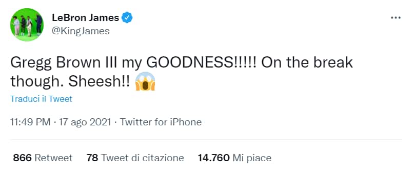 Un gesto tecnico e atletico che ha incantato anche LeBron James, che sembra sempre avere occhi per tutto quando si tratta di pallacanestro: "Mio Dio, in contropiede!!!! Sheesh!!!!", il commento ammirato della superstar dei Lakers. Un tweet che Greg Brown III con ogni probabilità si ricorderà a lungo, e che mostrerà felice ad amici e parenti. Con la speranza, poi, di ritrovarsi LeBron James da avversario su un campo NBA.