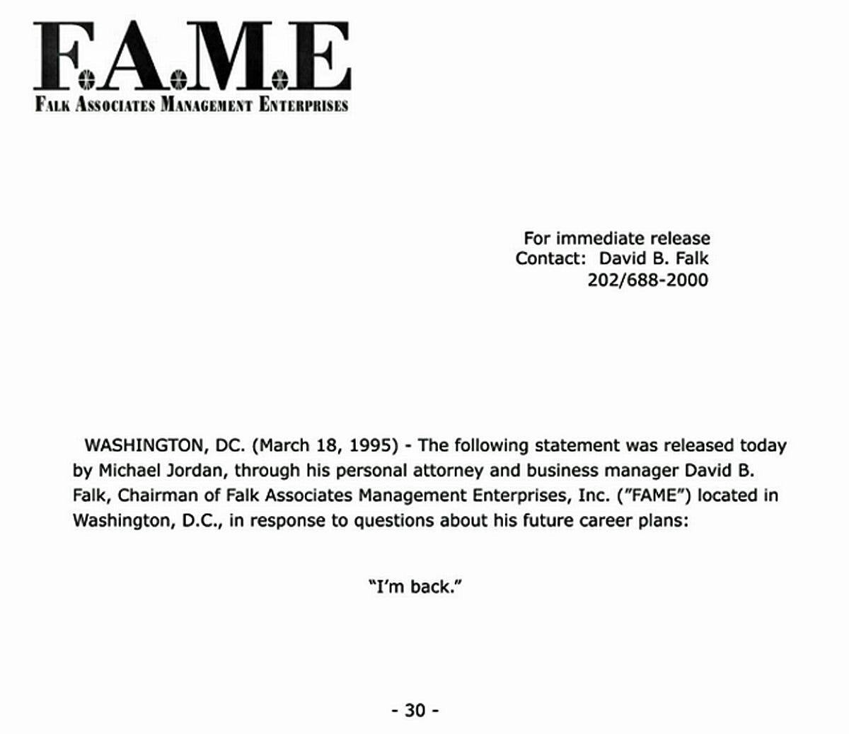 Il font è simile, lo stile identico e la distribuzione delle parole è studiata, tenendo in alto a sinistra nel foglio la scritta grande stilizzata in stampatello. Ventisei anni fa era “F.A.M.E” - acronimo della società Falk, sinonimo involontario di fama e più in generale un logo in qualche modo collegato alla figura di Michael Jordan negli anni ’90. Questa volta, nel post pubblicato per sorridere sui social dalla squadra della Capitale, è A.S.R. - Associazione Sportiva Roma, che con una pubblicazione immediata (proprio come accade nel marzo 1995), comunica utilizzando parte della stessa dicitura che Nicolò Zaniolo è tornato. Tre parole entrate di diritto nella storia della NBA e più in generale dello sport: “I’m back”, conclusione di una comunicazione stringata con cui, a meno di due anni di distanza dal suo ritiro dal basket giocato (deciso a sorpresa nel 1993, dopo aver conquistato per tre stagioni in fila il titolo NBA e a seguito della tragica scomparsa di suo padre), Michael Jordan decideva di tornare a calcare i parquet americani e di andare a completare l'opera, vincendo altre tre volte il Larry O'Brien Trophy e diventando una leggenda dello sport.