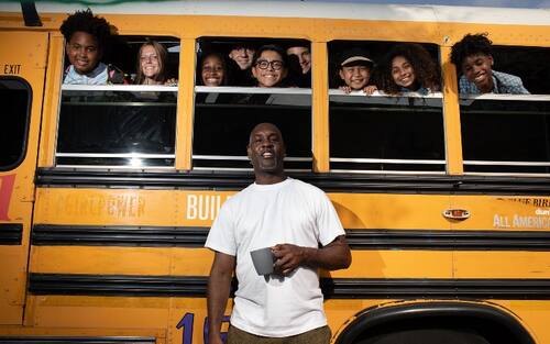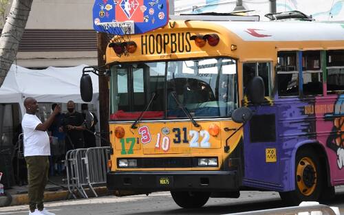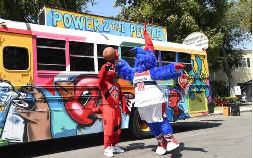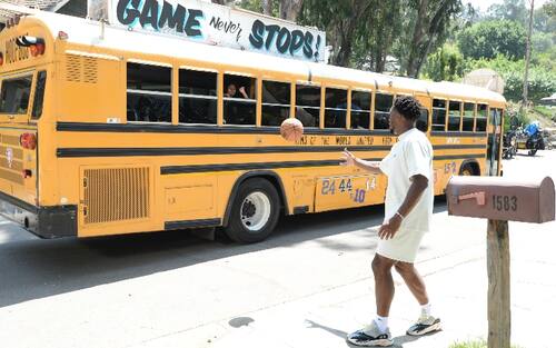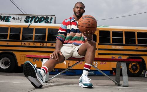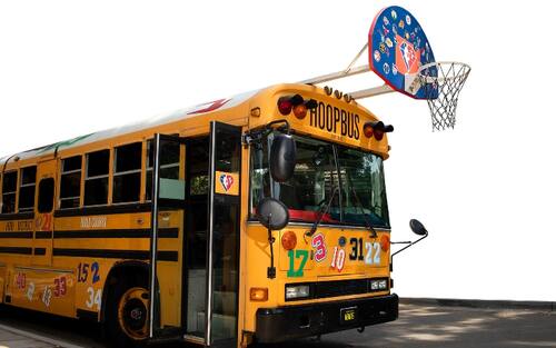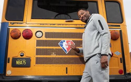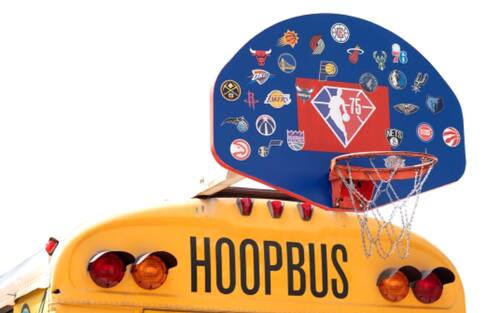 HOOP BUS | Ovviamente il bus guidato da Jordan somiglia a un classico school bus americano ma è accessoriato per l'occasione: sul tetto, ad esempio, un canestro, con gli adesivi di tutte le squadre NBA