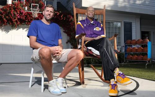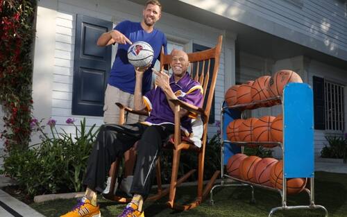 DIRK NOWITZKI & KAREEM ABDUL-JABBAR | Ma cosa è andato a fare Nowitzki a casa di Jabbar? Qual è il motivo di questa visita? Facile: il tedesco vuole conoscere i segreti del gancio cielo, l'arma letale del 33 gialloviola. E prova a imitarlo...
