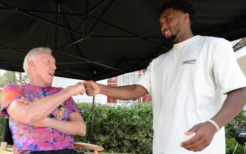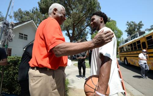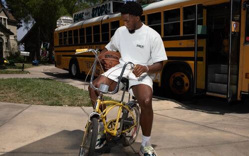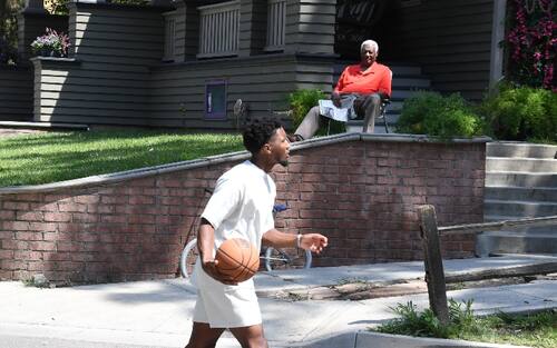 DONOVAN MITCHELL | ...oppure a piedi, ma sempre con un pallone in mano. E per le strade del quartiere capita di fare incontri eccellenti, come quello con Oscar Robertson, seduto a riposarsi fuori da casa sua