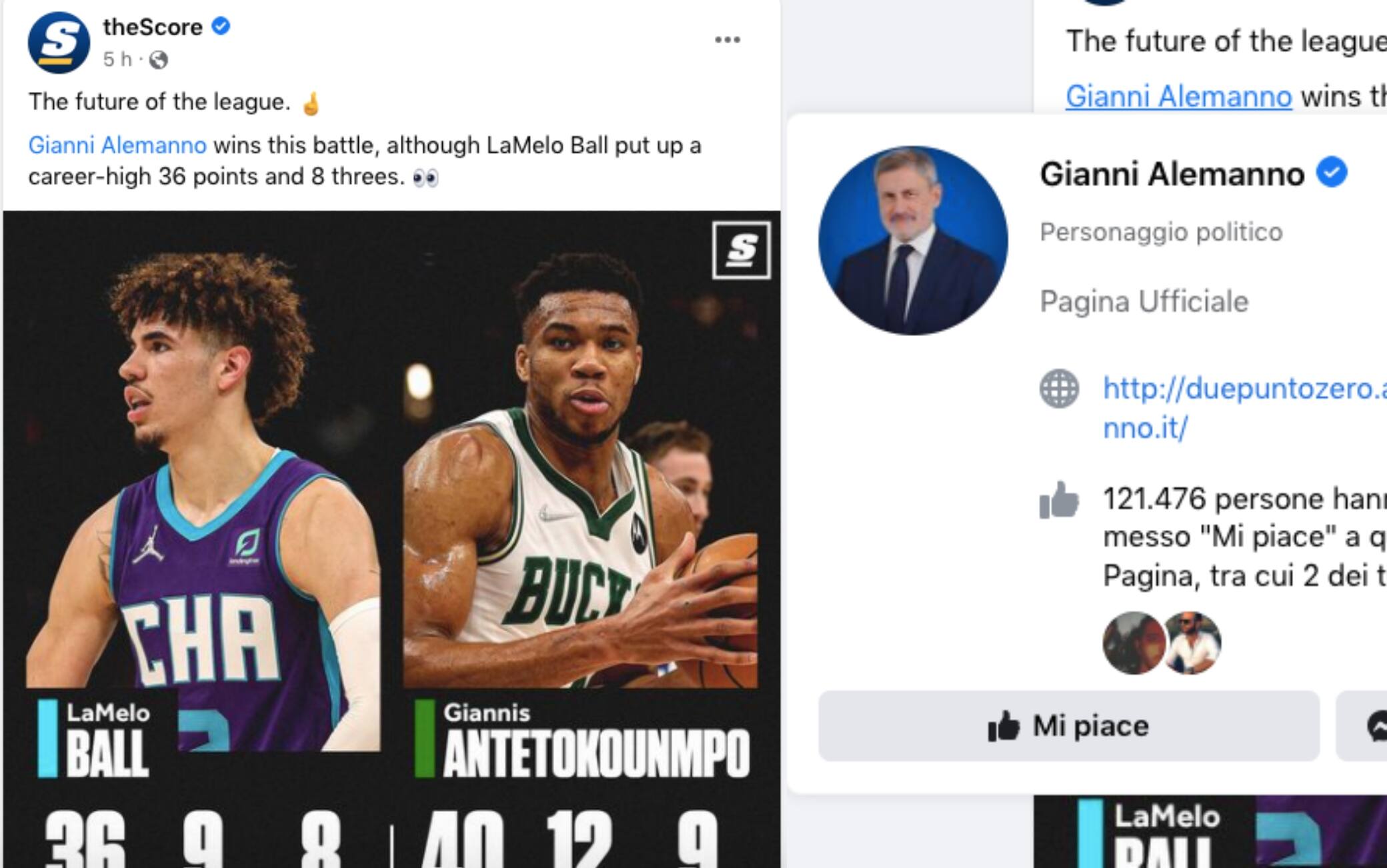 Dove sta quindi la notizia? Beh, nel fatto che al social media manager di The Score sarà scappata una “esse” in meno nel nome proprio di Giannis Antetokounmpo e così, quasi in automatico (come spesso accade su Facebook) è comparso il primo tag consigliato. Quale? Gianni Alemanno, ritrovatosi così per una notte a essere protagonista sui parquet NBA - e inevitabilmente sommerso di commenti dai tanti appassionati (non solo statunitensi) che si sono lanciati sull’errore e sull’equivoco nato dal nome di battesimo. “Il futuro della NBA nelle mani di un politico italiano?”, si domandano in molti, mentre la maggior parte si chiede da dove diavolo sia saltato fuori l’ex sindaco di Roma - che nell’estate 2008 era appena stato nominato primo cittadino della Capitale quando i nuovi Boston Celtics di Garnett-Pierce-Allen sbarcarono in città. Una coincidenza anche quella? “Grande partita Alemanno: 40 punti e quasi tripla doppia”, sottolinea un tifoso dei Bucks, ormai consapevole come altri che - nel caso si voglia taggare Antetokounmpo - bisogna fare attenzione alla "s" finale, altrimenti si diventa in un attimo ex sindaco di Roma.