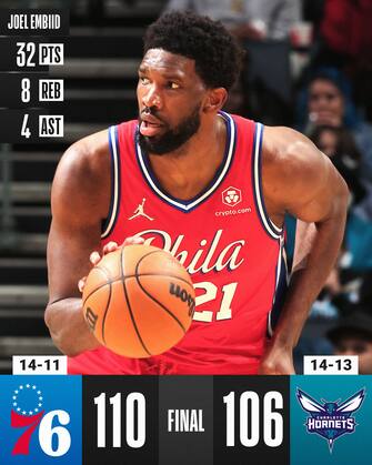 CHARLOTTE HORNETS-PHILADELPHIA 76ERS 106-110 | Sedicesima vittoria in fila per Philadelphia contro Charlotte, la seconda nel giro di tre giorni, arrivata grazie ai 32 punti realizzati da Joel Embiid (15/19 ai liberi e 8 rimbalzi), a cui s aggiungono i 23 punti e 8 assist di Seth Curry e i 18 con 7/13 dal campo per Tobias Harris. Un match che permette ai Sixers di chiudere sul 3-1 un giro di trasferte che rilanciano in parte la stagione della squadra della Pennsylvania, risalita al sesto posto in classifica a Est