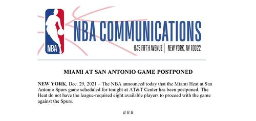 MIAMI HEAT-SAN ANTONIO SPURS: RINVIATA | La combinazione di infortuni e giocatori contagiati dal Covid non ha permesso invece di svolgere la sfida tra Miami Heat e San Antonio Spurs - prevista per oggi, ma con la squadra della Florida non in grado di avere a disposizione il numero minimo di otto giocatori richiesti per scendere in campo. È la 10^ gara che per motivi di questo genere viene rinviata nel corso di questa stagione