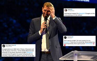 Davvero non sarebbe potuta esserci serata migliore per Dirk Nowitzki e i Dallas Mavericks. La cerimonia del ritiro della maglia numero 41 della leggenda tedesca, infatti, è arrivata dopo una grande vittoria dei padroni di casa ai danni dei Golden State Warriors, tenuti ad appena 82 punti. Dopo il successo, tutti gli spettatori della American Airlines Arena sono rimasti al propri posto per omaggiare Nowitzki, accolto dai cori di “MVP” del pubblico e da una lunghissima fila di ex compagni di squadra, accorsi in massa per celebrarlo. Accompagnato dalla sua famiglia (la moglie Jessica e i tre figli, che lo hanno aiutato a svelare il banner della sua maglia con le date di inizio e di fine della sua carriera), Nowitzki ha tenuto la parola per circa 20 minuti, cominciando con un aneddoto molto divertente: "Nel mio primo viaggio dalla Germania a Dallas ero nervoso, ma l’accoglienza all’aeroporto mi ha colpito. C’erano un sacco di persone che tenevano cartelli per me, facendomi sentire come se Dallas fosse il posto giusto. Quando ne ho parlato anni dopo con un impiegato dei Mavs, mi ha detto: 'Quelli non erano tifosi. Erano impiegati dei Mavericks costretti a stare lì per accoglierti'". In effetti Nowitzki è come se avesse creato la franchigia, che prima del suo arrivo non era neanche lontanamente andata vicina ai fasti toccati nel corso della sua carriera, con due Finali conquistate e il titolo del 2011 da MVP contro i Miami Heat. In uno dei passaggi più commoventi della serata, Nowitzki ha voluto ringraziare il suo allenatore e mentore Holger Geschwindner: "So che non ti piacciono le luci della ribalta, sei un tipo timido e modesto. Ma questa serata riguarda te tanto quanto riguarda me"