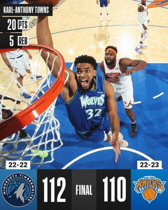 Sono 15 le partite di questa stagione in cui Towns e Edwards hanno realizzato 20 o più punti nella stessa gara: in tutta la lega solamente DeMar DeRozan e Zach LaVine ne hanno più di loro (23), che raggiungono la coppia James Harden-Kevin Durant in questa speciale statistica. È stata però la difesa a vincere la partita per i T’Wolves: dopo aver concesso 40 punti ai Knicks nel terzo quarto, i T’Wolves ne hanno fatti segnare solo 19 nel quarto periodo, di cui appena 3 negli ultimi 221 secondi di gara
