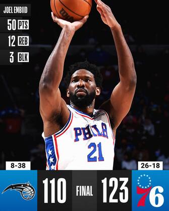 PHILADELPHIA 76ERS-ORLANDO MAGIC 123-110 | Joel Embiid resta in campo soltanto 58 secondi nel quarto periodo, giusto il tempo di ritoccare una prestazione clamorosa che regala ai Sixers la decima vittoria nelle ultime 12 gare (sempre più lanciati alla conquista delle prime posizioni della Eastern Conference). Una vittoria segnata da un terzo quarto da 47-23 di parziale e soprattutto dalle giocate del n°23 di Philadelphia, capace di fare canestro letteralmente in ogni modo