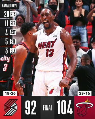 MIAMI HEAT-PORTLAND TRAIL BLAZERS 104-92 | Senza Jimmy Butler - espulso nel primo tempo dopo aver segnato soltanto 4 punti - e con Tyler Herro e Kyle Lowry non a disposizione, Miami riesce nel quarto periodo a sigillare la propria difesa, concedere un misero 5/26 al tiro agli avversari nell’ultima frazione (26-12 il parziale), conquistando così con merito una vittoria frutto dei 26 punti in uscita dalla panchina di Caleb Martin e dei 20 con 11 rimbalzi di Bam Adebayo. Inutili per Portland i 27 punti di Simons, i 24 di McCollum e i 18 con 14 rimbalzi di Nurkic