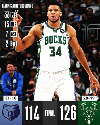 MILWAUKEE BUCKS-MEMPHIS GRIZZLIES 126-114 | I campioni NBA in carica battono un altro colpo in questa regular season e vincono una partita fondamentale contro un avversario complicato come Memphis - reduce da 12 vittorie nelle ultime 13 gare. Merito di un ottimo primo tempo Bucks e della capacità di reggere al ritorno in corso dei Grizzlies, tornati anche a sole 5 lunghezze di distanza ma incapaci di mettere il naso avanti nell’ultima mezz’ora di partita