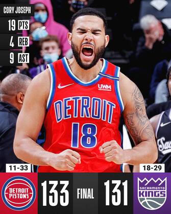 SACRAMENTO KINGS-DETROIT PISTONS 131-133 | Cory Joseph - grande ex di giornata, scaricato dai californiani lo scorso anno - segna il jumper del definitivo sorpasso a 25.9 secondi dal termine, chiudendo un parziale da 11-0 che regala il successo ai Pistons in rimonta sui Kings (che perdono così l’ennesima occasione per avvicinarsi alla zona playoff). Per Sacramento infatti è la settima sconfitta nelle ultime nove giocate