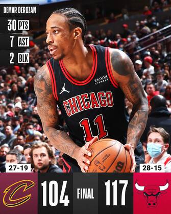 Senza gli infortunati Zach LaVine e Lonzo Ball, a trascinare Chicago ci pensano le giocate e i canestri di un DeMar DeRozan da 30 punti con 14/24 al tiro (e nessun tentativo dall’arco), 7 assist e un paio di stoppate, che vanno a sommarsi ai 24 punti e 12 rimbalzi di Nikola Vucevic. Prestazione chirurgica anche dall’arco per Chicago: 10/22 di squadra complessivo che permette soprattutto nel finale di scrollarsi di dosso Cleveland