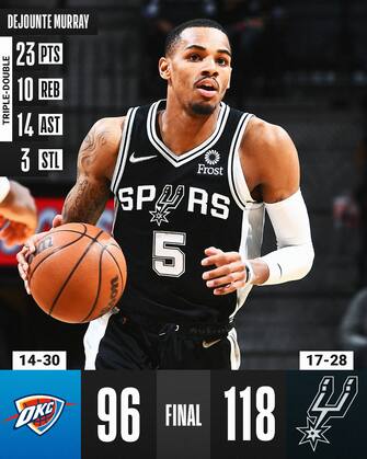 L’unica vera speranza di rilancio per gli Spurs (nel breve e soprattutto nel lungo periodo) è Dejounte Murray, protagonista da 23 punti, 14 assist e 10 rimbalzi - all’ottava tripla doppia stagionale e la n°12 della sua carriera. È lui l’anima di San Antonio, che anche non volendo resta a una partita e mezza di distanza dalla zona play-in grazie ai 20 punti con 6/9 dall’arco di Doug McDermott e ai 19 punti in uscita dalla panchina di Devin Vassell