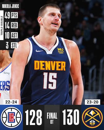 DENVER NUGGETS-L.A. CLIPPERS 130-128 OT | Denver vince una sfida spettacolare e divertente contro i Clippers, beffati all’overtime a 1.9 secondi dalla sirena dalla tripla di Aaron Gordon realizzata su assist di Nikola Jokic - decimo passaggio vincente nella serata del campione serbo, che chiude così in tripla doppia l’ennesima prestazione da ricordare e che regala ai Nuggets il quinto successo nelle ultime sette gare (dopo che il tentativo alla disperata di Reggie Jackson si è spento soltanto sul ferro)
