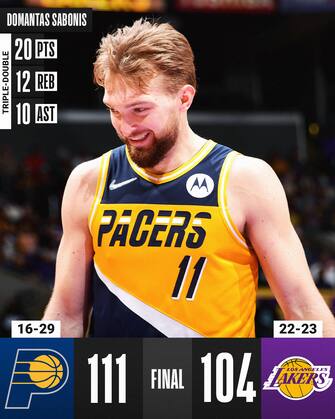 Discorso a parte va fatto per un altro giocatore molto chiacchierato e finito sul mercato da oltre un mese dopo che i Pacers hanno deciso di smobilitare la squadra e provare a ripartire mettendo in vendita i pezzi pregiati del roster: Domantas Sabonis chiude in tripla doppia, autore di 20 punti, 12 rimbalzi e 10 assist - con tanto di tripla che dà il colpo di grazia ai gialloviola, tornati ad avere un record al di sotto del 50% di vittorie (22-23)