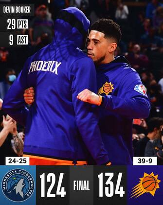 PHOENIX SUNS-MINNESOTA TIMBERWOLVES 134-124 | Nono successo consecutivo per la miglior squadra della NBA, i Suns, che segnano 40 punti nel solo primo quarto ma devono giocarsela fino all’ultimo contro i combattivi Timberwolves, confermandosi però imbattibili quando chiudono il terzo quarto in vantaggio (30 vittorie e zero sconfitte in stagione). Minnesota priva di D’Angelo Russell ha però dato filo da torcere, con 23 punti di Karl-Anthony Towns e 27 con 10 assist di Anthony Edwards