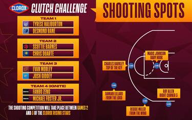IL FORMAT | Quattro coppie di giocatori - tre arrivano dalla NBA (Tyrese Haliburton-Desmond Bane; Scottie Barnes-Chris Duarte - sostituito da Tyrese Maxey-; Evan Mobley-Josh Giddey) e una della G League (Fanbo Zang-Michael Foster Jr.) - che si sfidano dovendo realizzare cinque canestri da cinque punti in cui sono stati segnati bersagli rimasti nella storia della Lega. L’ennesima occasione per celebrare il 75° anniversario della NBA