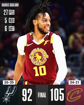 CLEVELAND CAVALIERS-SAN ANTONIO SPURS 105-92 | Darius Garland torna in campo dopo aver saltato quattro partite per problemi alla schiena e non mostra alcun segno di ruggine, chiudendo con 27 punti e guidando i Cavs alla settima vittoria nelle ultime nove (sette in fila in casa). Servono le sue giocate per fermare la rimonta degli Spurs, tornati a -7 nel quarto periodo dopo essere crollati anche a -23: sono 18 a testa i punti di Keldon Johnson e Devin Vassell, 16 per il neo All-Star Dejounte Murray