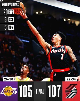 Neanche un avversario morbido come i Blazers basta ai Lakers per rimettersi in carreggiata, crollando nel finale e perdendo una partita che non si poteva perdere. LeBron James chiude con 30 punti, 7 rimbalzi e 7 assist seguito dai 17 di Anthony Davis, ma ai gialloviola non serve neanche una serata da 46% da tre punti (17/37) sbagliando tutte le decisioni nel finale, tra cui una sanguinosa palla persa di James in contropiede due contro uno che avrebbe dato il pareggio ai suoi a 1:53 dalla fine, punita da una tripla di Simons