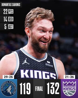 SACRAMENTO KINGS-MINNESOTA TIMBERWOLVES 132-119 | Domantas Sabonis presenta subito bene ai suoi nuovi tifosi, chiudendo con una doppia doppia da 22 punti e 13 rimbalzi al suo debutto con la maglia dei Kings. Le sue giocate insieme a quelle di De’Aaron Fox (27 punti) e Harrison Barnes (30) firmano un parziale di 14-2 nel quarto periodo che regala il successo a Sacramento, interrompendo a cinque la striscia di vittorie dei T’Wolves. Non bastano i 29 punti con 10 assist di D’Angelo Russell e i 26 di Anthony Edwards