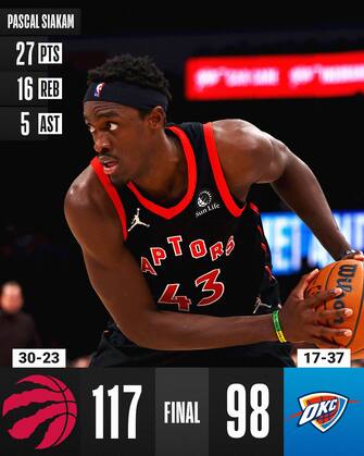 OKLAHOMA CITY THUNDER-TORONTO RAPTORS 98-117 | Tutto facile per i Raptors, che passano in vantaggio a metà primo quarto e rimangono avanti fino alla sirena finale, conquistando la settima vittoria consecutiva. Pascal Siakam è di nuovo splendido con 27 punti (13/17 dal campo, 15 punti nel primo quarto) e 16 rimbalzi, Fred VanVleet firma sei triple e chiude a quota 21 per la vittoria dei suoi. Gioventù al potere per OKC: i migliori marcatori sono Theo Maledon e Aleksej Pokusevski con 18 punti a testa