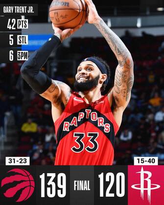 A farne le veci è stato soprattutto Gary Trent Jr., che ha firmato la sua settima partita stagionale sopra quota 30 realizzando il suo season-high da 42 punti, tirando 15/26 dal campo e 6/13 da tre. I suoi 25 punti nel solo primo tempo sono stati accompagnati dai 26 di Pascal Siakam, che ha poi chiuso a quota 30 con 13/19 dal campo risultando imprendibile per gli avversari, ricacciati indietro nel quarto periodo quando erano tornati sul -10 a 5 minuti dalla fine