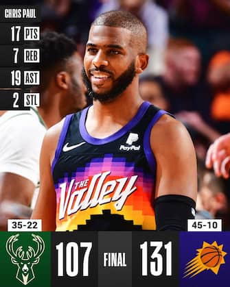 I Suns hanno avuto il solito grande sforzo collettivo, con Chris Paul che ha guidato l’orchestra chiudendo con 17 punti e 19 assist (500^ doppia doppia in carriera) per ispirare i 27 di Deandre Ayton, i 18 di Mikal Bridges e i 17 di Devin Booker, interrompendo la striscia di quattro successi in fila dei Bucks a cui non sono bastati i 21 a testa di Holiday e Middleton e i 18 con 7 rimbalzi e 8 assist di Giannis Antetokounmpo. Ad aggiungersi ai danni per i Bucks c’è anche l’infortunio alla mano destra di Pat Connaughton, che ha subito una frattura al 4° metacarpo