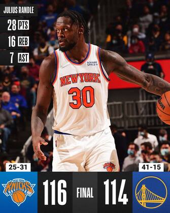 New York è così riuscita a vincere per la prima volta in questo giro a Ovest in cui avevano perso a Los Angeles, Salt Lake City e Denver, guidati dai 28 punti con 16 rimbalzi di Julius Randle e dai 22 di Evan Fournier per quella che è probabilmente la vittoria di maggior prestigio della loro stagione. Steph Curry è stato il migliore dei suoi con 35 punti e 10 assist, fallendo però il sottomano del pareggio nell’ultimo minuto di gioco con la palla che è rimasta sul ferro per diversi istanti prima di uscire
