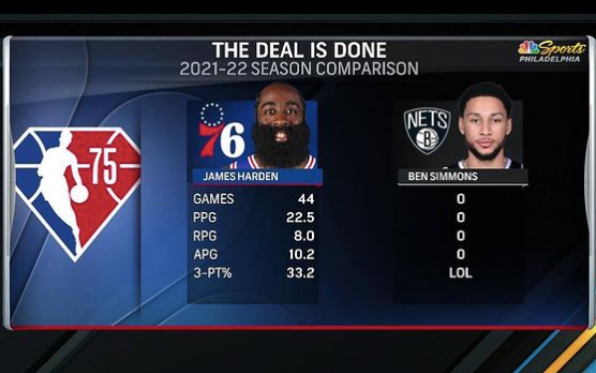 L'IMMAGINELa TV locale che trasmette le partite dei Sixers ha voluto rimarcare la differenza tra James Harden - che sta giocando, al netto dei problemi fisici, una stagione da All-Star con medie che si avvicinano alla tripla doppia e incisivo in attacco - e Ben Simmons, che invece è rimasto fuori per mesi senza scendere mai sul parquet. La chicca poi è il commento relativo alla percentuale da tre punti dei due giocatori: uno al 33.2% (quarto all-time per canestri dall’arco), l’altro "LOL”