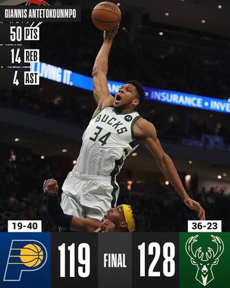 MILWAUKEE BUCKS-INDIANA PACERS 128-119 | Quattro partite e quattro vittorie stagionali per i Bucks ai danni dei Pacers, approfittando delle difficoltà degli avversari per rimettersi in carreggiata dopo la sconfitta contro Portland e preparandosi al meglio per il big match contro Philadelphia. Indiana rimane in partita per 40 minuti, ma nel quarto periodo viene definitivamente piegata da una serata magica di Giannis Antetokounmpo