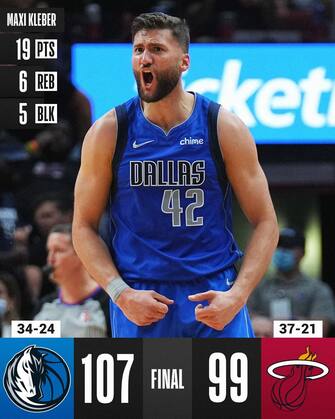 MIAMI HEAT-DALLAS MAVERICKS 99-107 | Successo di prestigio dei Mavs, che grazie alla difesa guidata da Maxi Kleber (19 punti, 6 rimbalzi ma soprattutto 5 stoppate) prendono il controllo del match in un terzo quarto da 30-19 e vincono a Miami. Luka Doncic tira male con 5/19 e viene costantemente raddoppiato, ma segna 11 dei suoi 21 punti nella terza frazione e viene sostenuto dai compagni, con Brunson (19), Finney Smith (14), Kleber e il neo arrivato Bertans (12) che segnano 20 delle 39 triple tentate