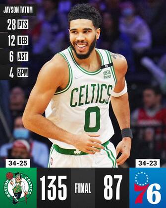 PHILADELPHIA 76ERS-BOSTON CELTICS 87-135 | Nella storia della NBA non era mai capitato che una squadra vincesse tre partite in trasferta consecutive con almeno 30 punti di scarto. Beh, la statistica va riaggiornata perché i Celtics lo hanno appena fatto, rifilando un clamoroso -48 ai Sixers (miglior vittoria nelle 457 partite di questa storica rivalità) per conquistare la nona vittoria consecutiva. Dopo aver toccato il +27 all’intervallo, Boston ha continuato a macinare canestri chiudendo con 25 triple a segno, nuovo record di franchigia
