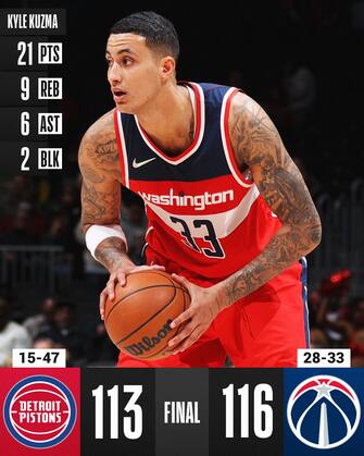 WASHINGTON WIZARDS-DETROIT PISTONS 116-113 | Kyle Kuzma chiude con 21 punti, Thomas Bryant ne aggiunge 16 e gli Wizards vincono per la 14^ volta in fila in casa un testa a testa contro i Pistons - la striscia più lunga contro un singolo avversario nella storia della franchigia, avvicinando nuovamente il 10° posto a Est (distanza una sola partita). Detroit recupera i 12 punti di svantaggio nell’ultimo quarto, pareggiando a quota 104 a 200 secondi dal termine con Saddiq Bey - autore di 19 punti che sbaglia la conclusione del pareggio dall’arco sulla sirena