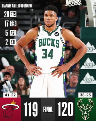 MILWAUKEE BUCKS-MIAMI HEAT 120-119 | I "Big Three" dei Bucks hanno portato a Milwaukee il titolo NBA e sembrano intenzionati a non smettere: sono loro i grandi protagonisti del successo su Miami, ispirati dai 28 punti con 17 rimbalzi, 5 assist, 2 recuperi (e un ottimo 9/11 ai liberi) di Giannis Antetokounmpo, dai 26 con 4/8 da tre di Khris Middleton e dai 25 con 11 assist e 6 rimbalzi di Jrue Holiday, autore del canestro decisivo a 1.9 secondi dalla fine che corona la rimonta dei Bucks da -14