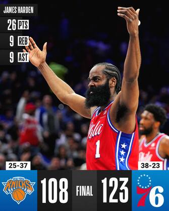 PHILADELPHIA 76ERS-NEW YORK KNICKS 123-108 | Philadelphia continua a vincere e convincere con i nuovi "Big Three": Embiid (27 punti e 12 rimbalzi), Maxey (25) e soprattutto Harden (26 con 9 assist e 9 rimbalzi, al suo debutto davanti al nuovo pubblico di casa) sono troppo per i Knicks, che concedono ai Sixers il 52% al tiro dal campo e oltre il 47% da tre (17/36), subendo un letale 38-19 nel terzo quarto, il momento in cui si decide la partita