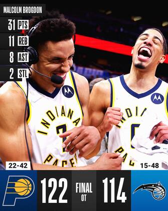 ORLANDO MAGIC-INDIANA PACERS 114-122 OT | I Pacers riscattano nel giro di due giorni la sconfitta contro i Magic, recuperano ben 15 lunghezze di svantaggio a Orlando e superano i padroni di casa nei cinque minuti supplementari grazie a un super Malcolm Brogdon (che realizza 14 punti nel solo quarto periodo). Decisivo anche Tyrese Haliburton con i suoi 21 punti e sei assist (5 dei 12 punti dell’overtime portano la sua firma), mentre Jalen Smith chiude con 15+15 in uscita dalla panchina e un eloquente +27 di plus/minus