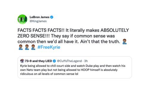 Anche LeBron James, ex compagno di Kyrie Irving a Cleveland, ha commentato su Twitter l'assurdità della situazione: "Non ha letteralmente senso!! #FreeKyrie"