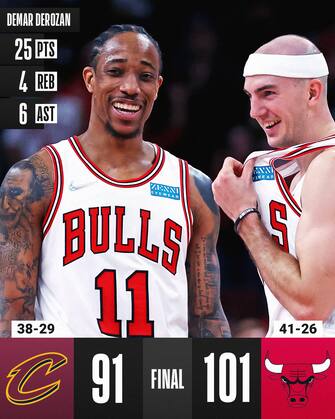 CHICAGO BULLS-CLEVELAND CAVALIERS 101-91 | Chicago ritrova Alex Caruso dopo 22 partite di assenza e, pur senza Zach LaVine alle prese col solito ginocchio dolorante, trova anche la seconda vittoria in fila dopo la striscia di cinque ko consecutivi che li aveva fatti scendere al quarto posto a Est. Merito dei 25 punti di DeMar DeRozan e dei 20+14 di Nikola Vucevic contro una possibile rivale al primo turno come Cleveland, a cui non bastano i 25 di Darius Garland (tirando 9/24 dal campo) per evitare l’ottava sconfitta nelle ultime undici