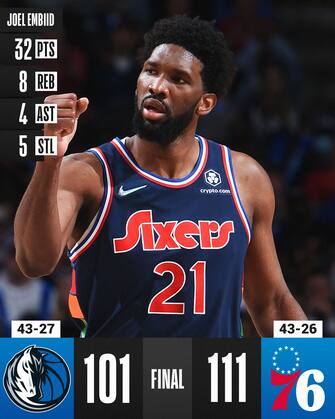 PHILADELPHIA 76ERS-DALLAS MAVERICKS 111-101 | Seconda vittoria in fila per i Sixers, che prendono il controllo del match nel secondo tempo e toccano anche il +20 nel quarto periodo, fermando una delle squadre più in forma della NBA. Merito soprattutto di una difesa capace di limitare Luka Doncic a 17 punti e 10 assist con 5/20 al tiro e 2/10 dalla lunga distanza, concedendo al massimo 24 punti al prodotto di Villanova Jalen Brunson, che ha segnato i primi 7 tiri tentati nella sua partita per guidare un quintetto tutto in doppia cifra