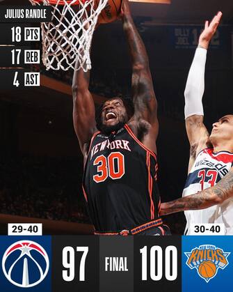 NEW YORK KNICKS-WASHINGTON WIZARDS 100-97 | Grazie ai 18 punti a testa di Julius Randle (autore anche di 17 rimbalzi) e RJ Barrett i Knicks resistono ai tentativi di rimonta degli Wizards, che falliscono la tripla del pareggio allo scadere con Kentavious Caldwell-Pope. Gli ospiti non riescono a evitare la sesta sconfitta consecutiva nonostante una difesa capace di tenere gli avversari al 34.4%, ma senza riuscire a completare una rimonta partita da -15. Per gli ospiti ci sono 18 punti dell’ex Kristaps Porzingis e altrettanti di Kyle Kuzma