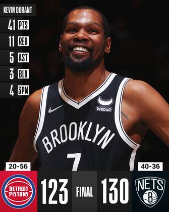 Il tabellino finale di KD racconta bene il suo dominio in campo: 41 punti, 11 rimbalzi, 5 assist, 3 stoppate, 14/23 al tiro di cui 4/6 da tre e un perfetto 9/9 ai liberi per guidare un quintetto tutto in doppia cifra, a cui si aggiungono i 24 di Kyrie Irving (ancora impreciso al Barclays Center con 7/18 dal campo). Insieme a loro ci sono i 15 di Bruce Brown e i 14+13 di Andre Drummond, in doppia cifra anche Seth Curry e Nic Claxton entrambi a quota 11