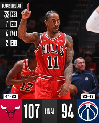 WASHINGTON WIZARDS-CHICAGO BULLS 94-107 | Seconda vittoria nelle ultime tre per i Bulls, che si aggrappano a DeMar DeRozan per rimanere al quinto posto nella Eastern Conference davanti a Toronto e Cleveland. Serve però un ultimo quarto da 32-21 per avere ragione dei combattivi Wizards, guidati dai 21 punti di Rui Hachimura e i 20 di Kentavious Caldwell-Pope. Con Zach LaVine opaco nel primo tempo, è stato ancora DeRozan a salire di livello