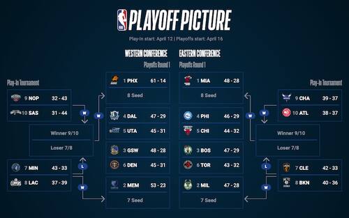 Questa la situazione al torneo play-in e ai playoff se la stagione finisse oggi. I Lakers ora come ora sono fuori, raggiunti dai San Antonio Spurs al decimo posto. Milwaukee si prende il secondo posto a Est a sola mezza gara di distanza dal primo occupato da Miami, mentre Philadelphia al quarto dovrebbe affrontare i Chicago che ha un vantaggio risicato su Toronto e Cleveland. Brooklyn risale all'ottavo posto
