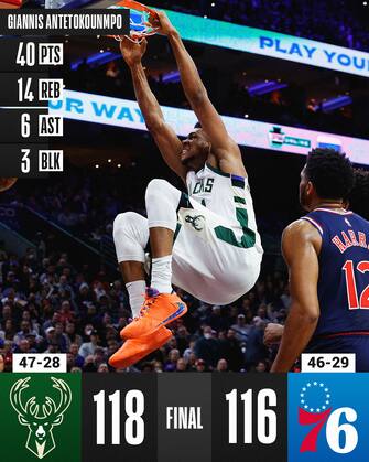 Antetokounmpo ha dato spettacolo lungo tutta la partita, realizzando una clamorosa schiacciata mancina sulla testa di Joel Embiid per rispondere alle giocate di James Harden dall’altra parte. A fine gara sono 40 i suoi punti con 14 rimbalzi, 6 assist e 3 stoppate, tirando 16/24 dal campo e 7/10 ai liberi per trascinare i suoi alla vittoria. In doppia cifra anche Khris Middleton con 22, 9 rimbalzi e 7 assist, Jrue Holiday vicino alla tripla doppia con 18-8-10 e Brook Lopez da 17, oltre a Grayson Allen con 10 dalla panchina