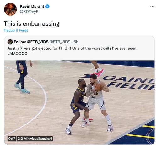 Una delle reazioni più dure e nette a riguardo arriva da Kevin Durant, che ripostando il video dà voce a quello che è il pensiero comune di molti: "Una chiamata imbarazzante"