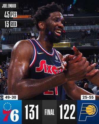 INDIANA PACERS-PHILADELPHIA 76ERS 122-131 | Un Joel Embiid da MVP e un primo tempo da 17 triple a bersaglio (record di franchigia in una singola frazione) bastano e avanzano per travolgere i Pacers e provare a guadagnare posizioni in vetta alla Eastern Conference: a segnare il match è un secondo quarto da 49-28 di parziale in favore degli ospiti, che si prendono così il secondo posto a Est a pari merito nonostante i 25 punti con 11 rimbalzi di Buddy Hield e i 21 punti realizzati da Tyrese Haliburton