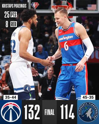 MINNESOTA TIMBERWOLVES-WASHINGTON WIZARDS 114-132 | La sconfitta più inattesa della serata è quella incassata da Minnesota in casa contro Washington - una squadra che non ha più niente da chiedere a questa stagione, guidata dai 25 punti di un Kristaps Porzingis che ne segna 12 nel solo terzo quarto. Naufragano così le ambizioni T’Wolves di evitare il play-in, con i padroni di casa che non vanno oltre i 26 punti e 10 rimbalzi di Karl-Anthony Towns e i 17 con 11 assist di D’Angelo Russell; persa così un’occasione ghiotta, visto il concomitante passo falso di Denver