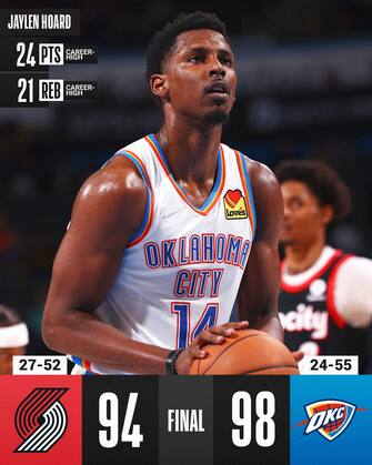 OKLAHOMA CITY THUNDER-PORTLAND TRAIL BLAZERS 98-94 | I Blazers arrivano a +18 a 10 minuti dalla fine, poi spengono il motore e lasciano che i Thunder li sorpassino e poi li battano con un parziale di 26-4 per chiudere la partita. Il protagonista decisamente inatteso è Jaylen Hoard, appena firmato con un contratto di 10 giorni dai Thunder e autore di una doppia doppia da 24+21 regalandosi una serata da sogno. "Quel Jaylen Hoard si è fatto il mazzo, non abbiamo potuto farci niente per tutta sera" le parole di coach Billups dopo il match